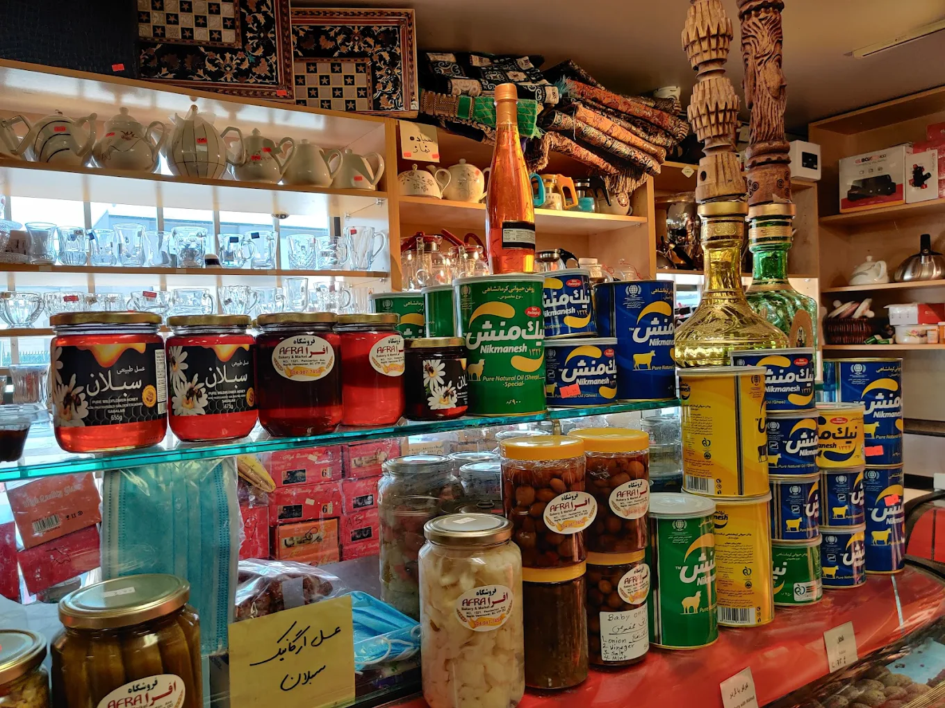 انواع خشکبار، آجیل، چای وارداتی و پنیرهای مختلف در قفسههای فروشگاه افرا پیدا میشود. بخش بزرگی از مغازه به زیتون و خوراکیهای آماده اختصاص دارد که طرفداران خودش را دارد. خیلی از مشتریها به نان سنگک تازه و غذاهای آماده مثل باباغنوش هم اشاره کردهاند که با قیمت مناسب عرضه میشوند.