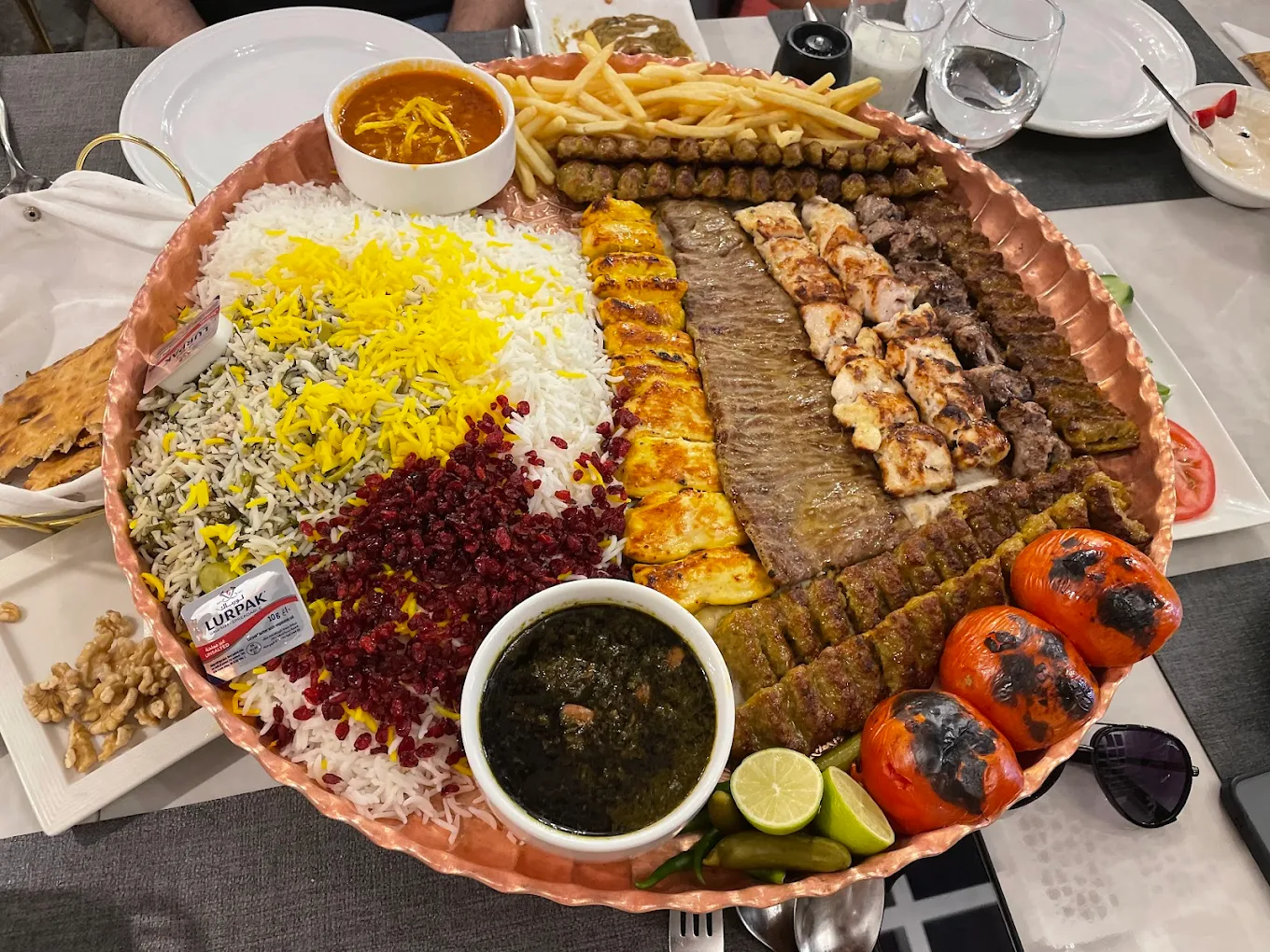 For those who prefer an elegant dining experience, Firuzeh Restaurant brings Persian cuisine to the heart of Dubai Marina, offering a luxurious, waterfront setting. This fine-dining restaurant is celebrated for its cozy, romantic atmosphere and its commitment to traditional Iranian flavors. A standout feature is Firuzeh’s in-house bakery, where they prepare fresh Persian breads daily. Guests can enjoy a beautiful breakfast spread with Taftoon or crispy Sangak, both baked with a level of finesse rarely found outside Iran. Their sangak also accompanies signature dishes such as slow-cooked Dizi, making the meal feel wonderfully complete.