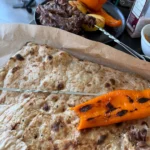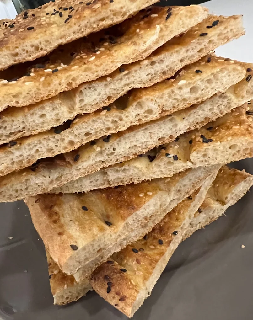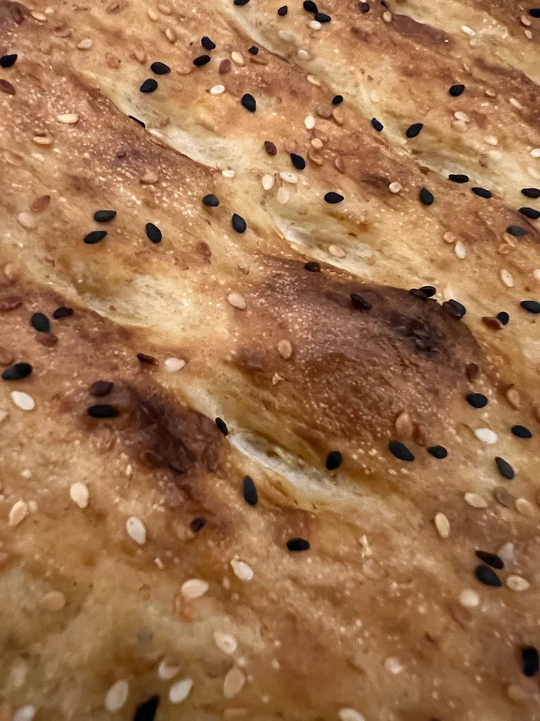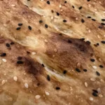Noon Sangak is one of Iran’s most cherished national breads. This lovely bread is a long, whole-wheat flatbread baked directly on a bed of hot river stones. The word “Sangak” literally means “small stones!” Sangak is wonderfully simple in ingredients; just whole-wheat flour, water, yeast, and salt. However, the result that comes out of the oven is anything but simple. The bread comes out thin yet sturdy, with a nutty aroma, crisp edges, and a soft chew that makes it perfect for tearing, dipping, or wrapping around grilled meats. Some bakeries add sesame or poppy seeds on top, giving it an extra layer of richness.